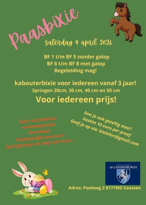 Opgeven kan via bixiehvc@gmail.com. Heb je geen (verzorg)pony? Ook dan ben je welkom voor leuke spelletjes, eieren zoeken, stokpaardjes race en nog veel meer! Delen van dit bericht mag