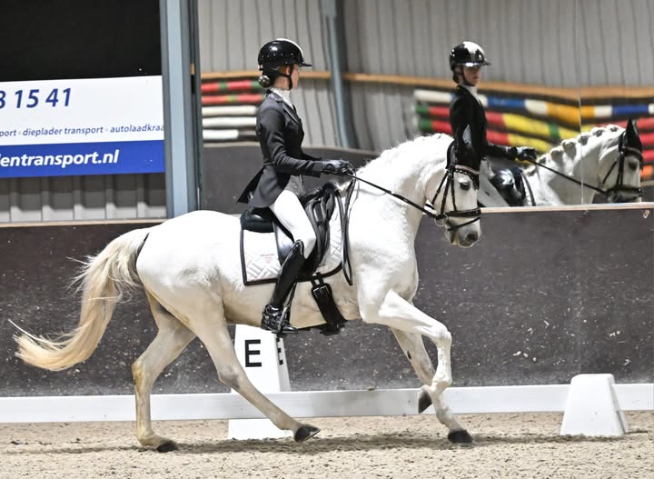 Han Aalmans kwam afgelopen week ( 25-29 oktober) aan de start tijdens de ‘Zilveren Pauw’ in Ermelo. Met haar paard Morris maakte ze haar debuut in de klasse M1 dressuur. Ze behaalden hier een 1e en 2e prijs en een ticket voor de finale op zaterdagavond!🥇🥈 Ook hier reden ze een nette proef en werden ze over alle klasses 11e met gemiddeld 63,7% van de twee juryleden!
