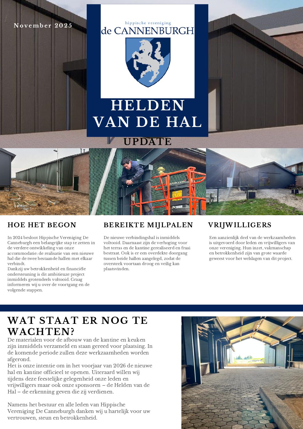 Samen bouwen aan een betere ervaring! Met de overkapping tussen onze rijhallen zorgen we voor een droge oversteek en de mogelijkheid om meer van de wedstrijdbak te zien. Bovendien hebben realiseren we de tijdelijke kantine, zodat we onze ruiters en toeschouwers nog beter kunnen verwelkomen. Uw steun maakt dit alles mede mogelijk!